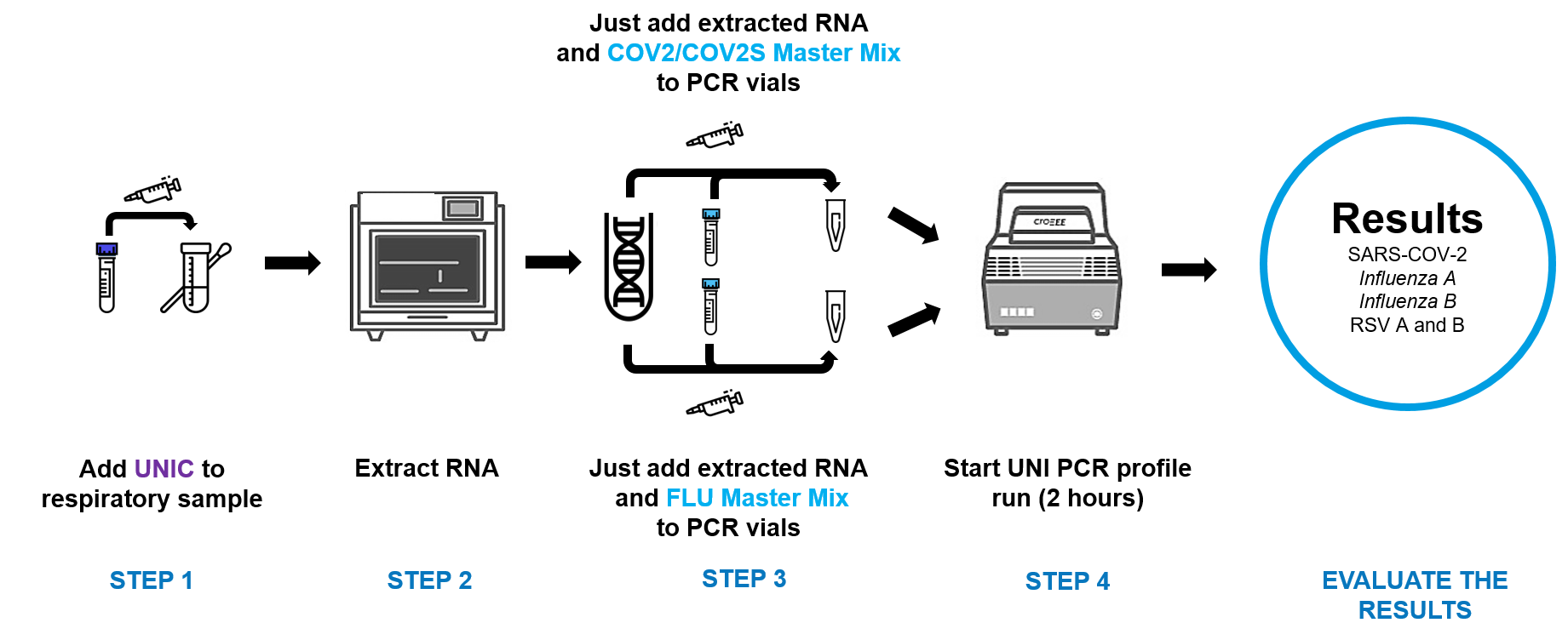 • Diagnostics of SARS-CoV-2, Influenza A, Influenza B, RSV A and B